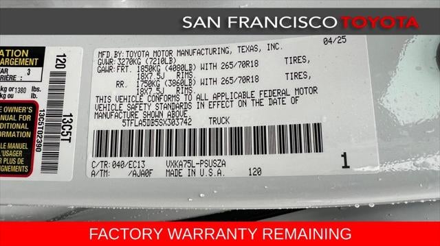 The 2025 Tundra SR5 delivers the strength and durability truck buyers expect, powered by Toyota’s advanced i‑FORCE turbocharged engine for confident towing and smooth acceleration. The Premium Package elevates your experience with upgraded comfort, convenience features, and premium interior touches—perfect whether you're hauling equipment or cruising through the Bay Area.